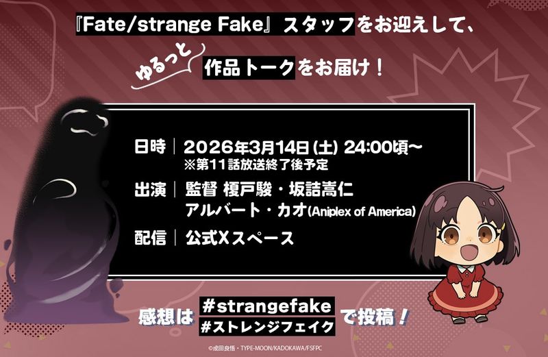 TVアニメ『Fate/strange Fake』第11話放送終了後、榎戸駿監督・坂詰嵩仁監督・スタッフが出演する作品トークをXスペースで配信開始。Aniplex of Americaのアルバートさんがゲスト出演!