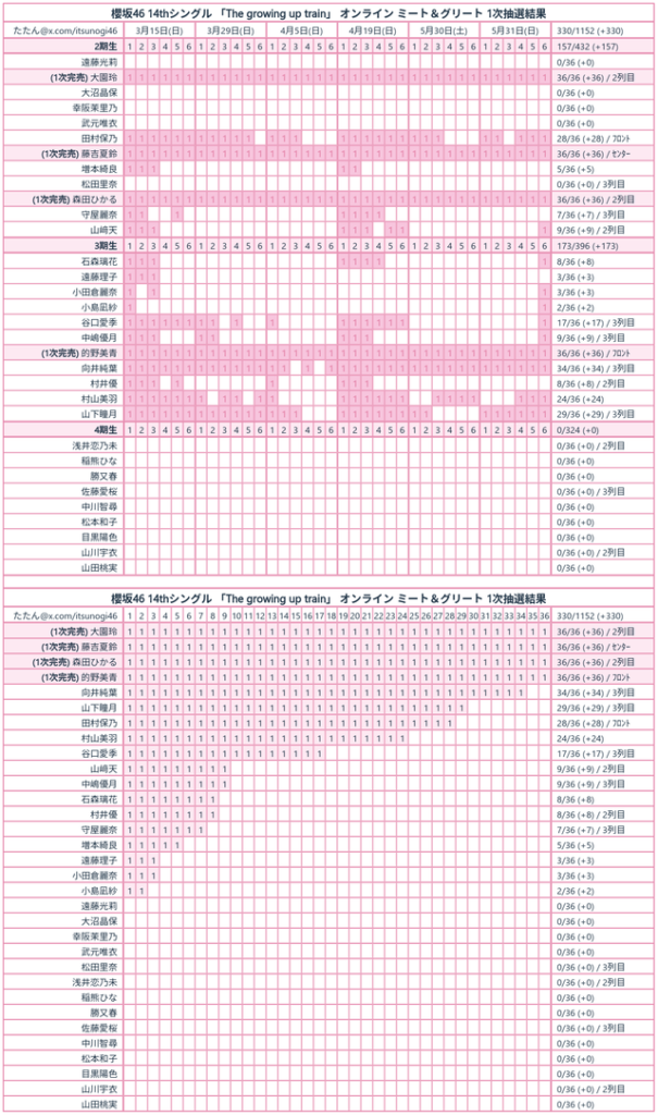 【表×2】櫻坂46「The growing up train」ミーグリ1次完売表