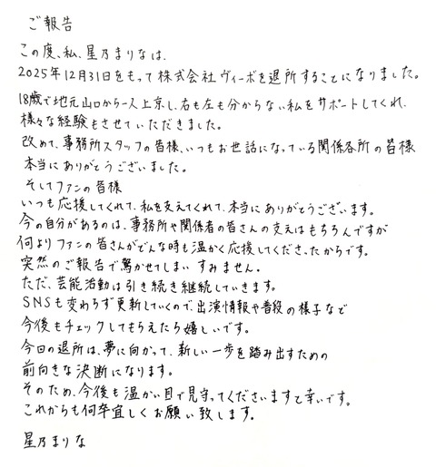 【元STU48】星乃まりな、12月31日をもって株式会社ヴィーボを退所