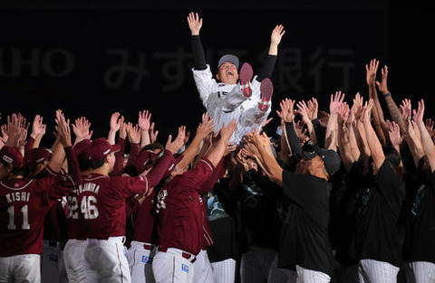 美馬引退セレモニーで銀次嶋則本松井裕ウィーラー田中将からビデオメッセージ 岸より花束贈呈 両軍ベンチ回って挨拶 ロッテ楽天ファン双方から惜別の応援の中 両軍選手集まって胴上げ