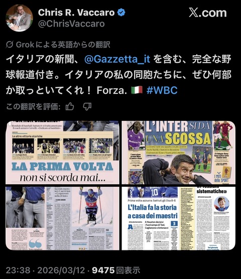 【朗報】イタリアの大手スポーツ新聞がWBCを取り上げるwwwwwww