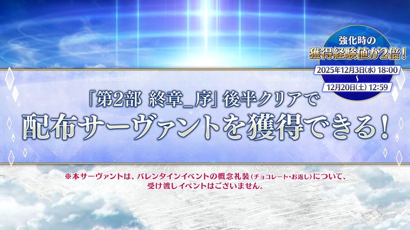 【FGO】「第2部 終章_序」後半をクリアすることで加入する限定サーヴァント。バレンタインイベントの概念礼装(チョコレート・お返し)の受け渡しの対象外であることが明らかに