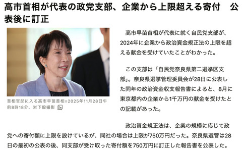 【トップが堂々と法を破る国】自民党奈良県第二選挙区支部 企業から上限超える寄付